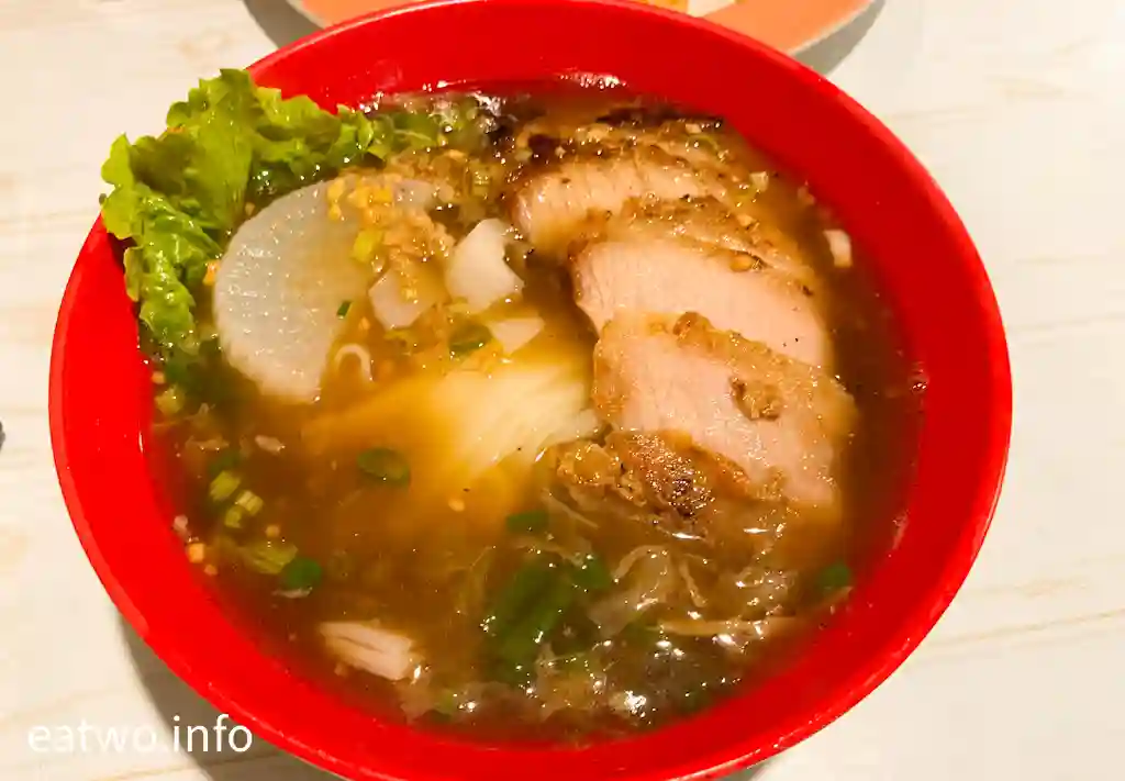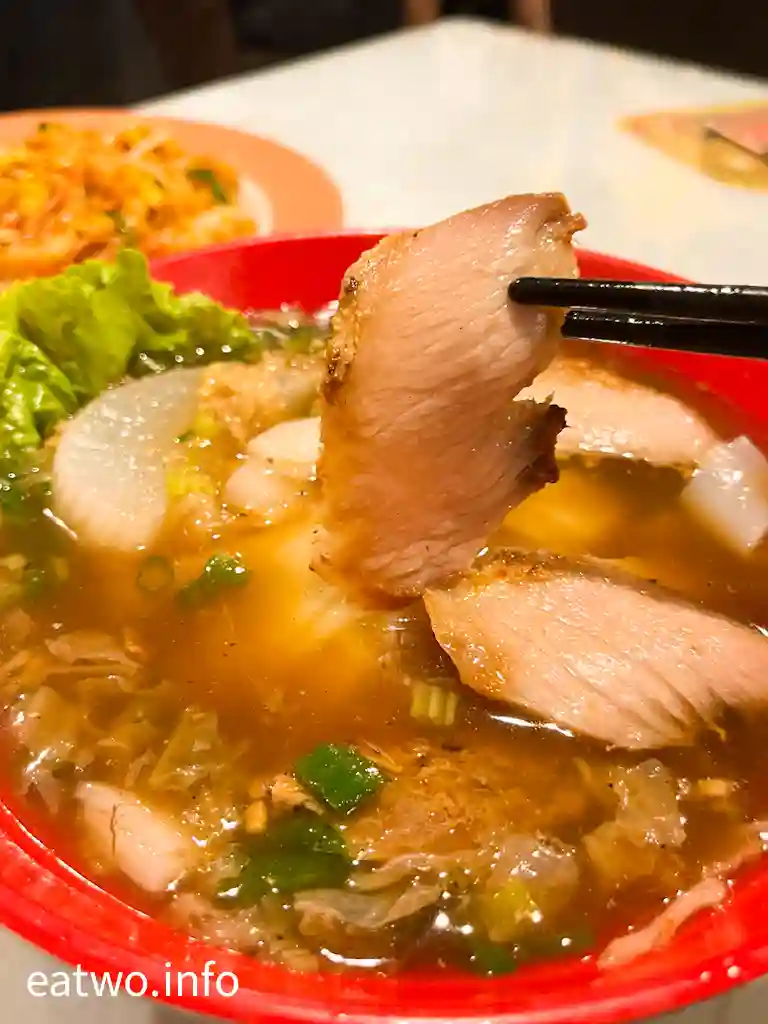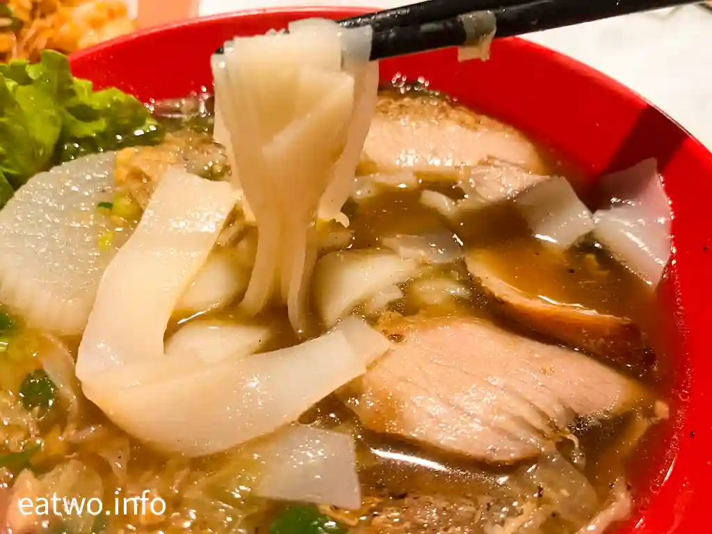 午市套餐有飯同湯粉可以選擇,今次一碗係炭燒豬頸肉湯河$48,一碟係鮮蝦炒金邊粉$60。炭燒豬頸肉係燒香過,有少少似炭香,肉質係軟腍,表皮有啲硬,不過不失。估唔到最特別嘅係河粉,順滑之餘,係比一般河粉粗身。