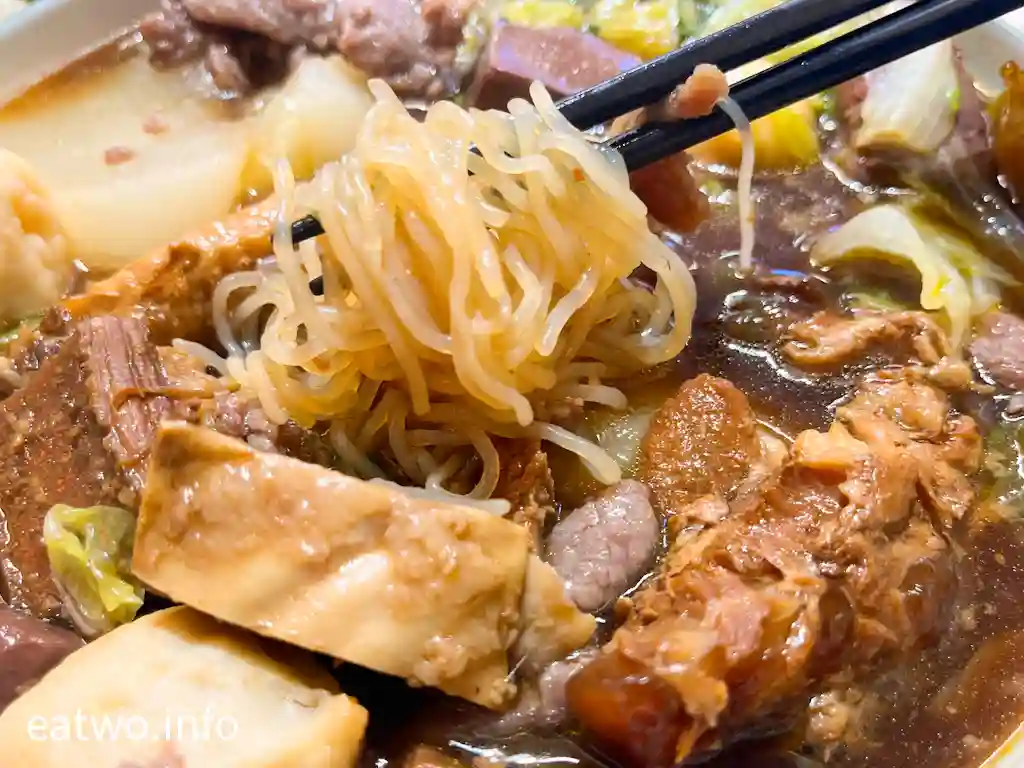大碗車仔麵上檯一刻都算霸氣,第一下覺得好似打邊爐,第二下覺得有啲似中式盆菜。而麵條中,比較特別嘅係日本有機蒟蒻粉絲。不過,腸胃較差嘅讀者就要留意,呢款麵條未必係你適合食嘅選擇,因為蒟蒻本身係纖維豐富,亦唔容易消化,腸胃唔係咁好嘅話,好易會引致胃痛。