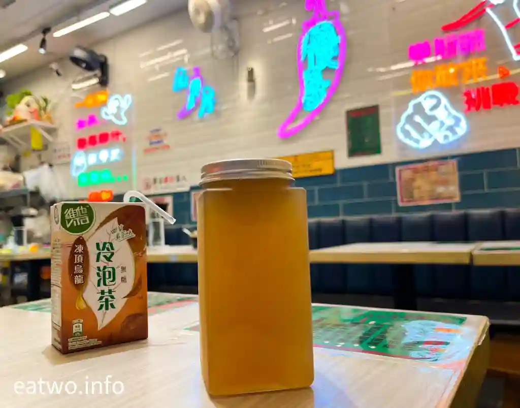 藤椒鮮魚皮上檯可以見到上面鋪滿橙紅色辣椒同醬汁,一夾起魚皮,質感係實淨,而唔係淋身。魚皮入口超爽脆,同時滲出辛香辣味,麻中有辣,而辣度係適中,唔係死辣。咬開魚皮,辣度慢慢向上,而去到最頂嘅辣度又係大眾可以接受嘅程度,唔會辣度好過份。點車仔麵嘅時候,點紙包飲品就唔使加錢,而另一款比較特別嘅係菊花麥冬桂花金羅漢果茶,只係加$6,入口清甜,菊花味比較搶,都算係適合配搭辣嘅小食同湯底。