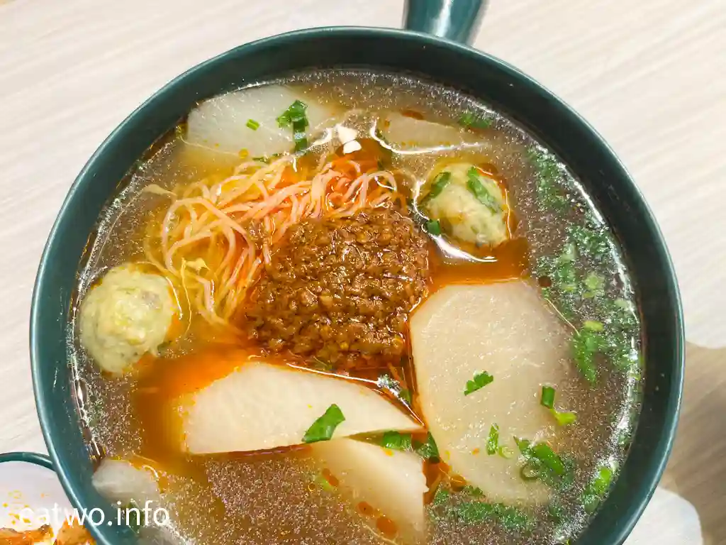 除咗有腩汁、沙嗲汁、咖哩汁、蒜辣汁,重有靈魂辣汁,可以揀麻酸辣。講咗咁耐,都未提到呢間小店嘅主打,其實佢主打就係一個字﹕辣!而辣汁就係必加嘅選擇。至於車仔餸,比較特別嘅係鮮味芫荽鯪魚丸、炸腐皮墨魚卷、鮮蝦鳳城水餃、潮汕鮮蝦餅、潮汕墨魚餅、招牌秘製五香牛腩、招牌秘製豬軟骨,牛腩質感麻麻,蘿蔔份量唔少同清甜無渣,但豬軟骨就好入味好軟腍。