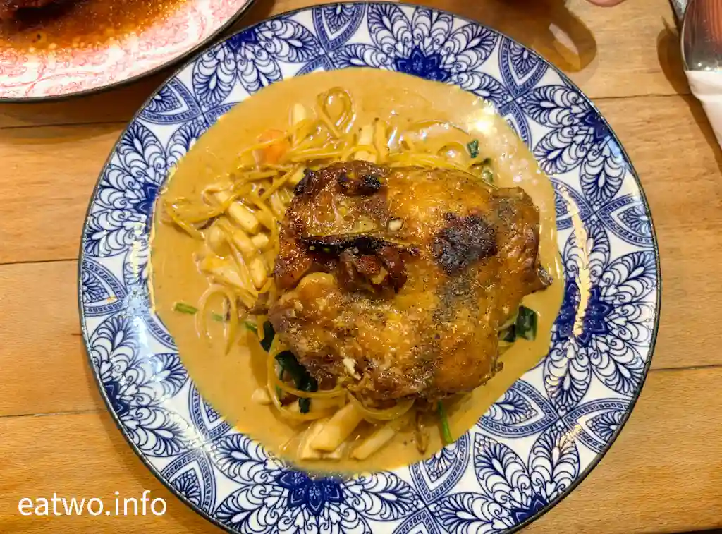 西班牙紅酒焗鴨胸可以配薯茸或意粉,我哋食緊先發現係手工薯茸,換言之真係薯仔壓爛成蓉,可以一試。鴨胸並唔係即食嗰啲,用料實在,而撈意粉嘅醬汁就係酸酸甜甜,有蕃茄粒,只有少少揮發後留低嘅紅酒味。如果要隔硬批評,就係意粉擺盤唔係兜個圈咁擺落去囉,但而家就似家庭式感覺。不過,最特別嘅係表皮,上面灑上砂糖,帶有焦糖嘅焦脆感,所以入口係微甜,而且增加層次。紅棗黑糖雞腿肉意大利麵同樣係帶有微甜味,皆因有紅棗、黑糖,雞肉軟嫩,醬汁撈意粉濃度適中,重有菇菇同菠菜等配菜一齊炒。