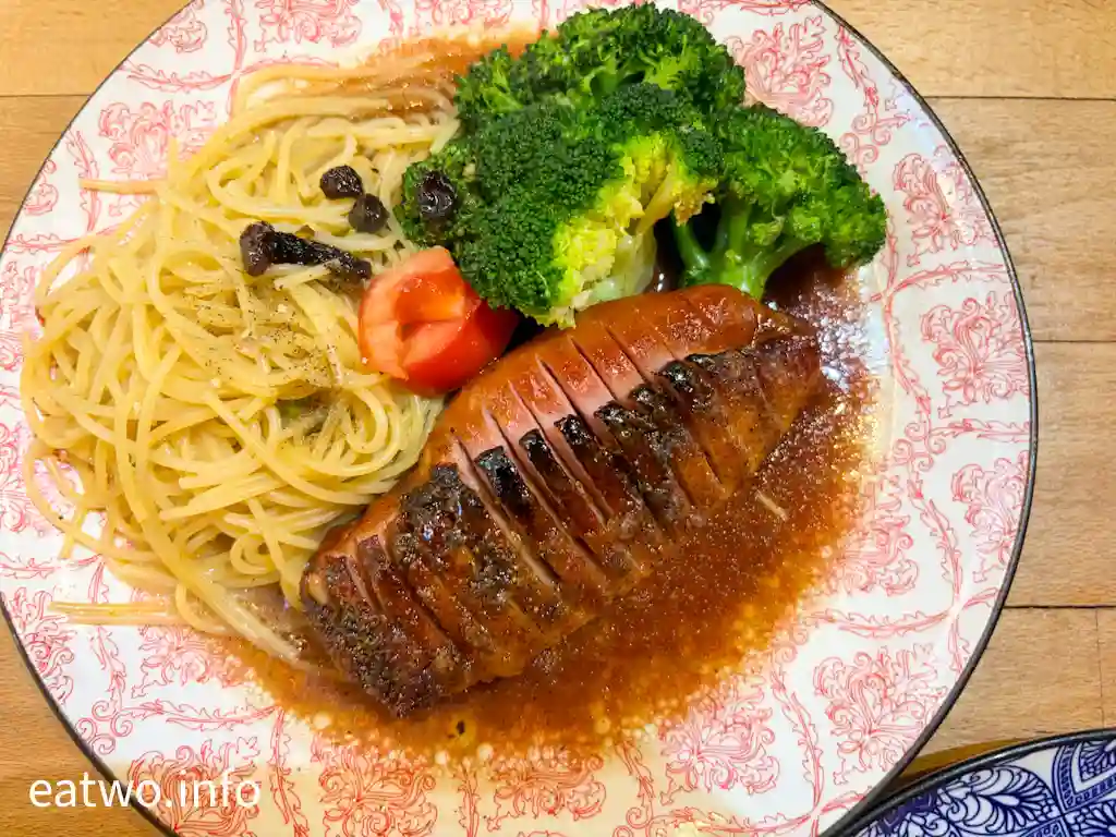 主食有招牌西班牙紅酒焗鴨胸$88,可配意大利麵或手工薯茸,有黑糖西梅雞腿肉配意大利麵$74,其他有歐式全餐$110,入面有自家製窩夫、牛仔腸、炒蛋、沙律、牛角包、手工果醬、炒野菌。另外,重有吞拿魚菠蘿烘包$62、溫室南瓜鷹嘴豆沙律$62、忌廉咖喱雞肉青瓜意大利麵$68、藍芝士蘋果累豚肉意大利麵$68、千島三文魚菠菜意大利麵$72,當中包含有素食之選。