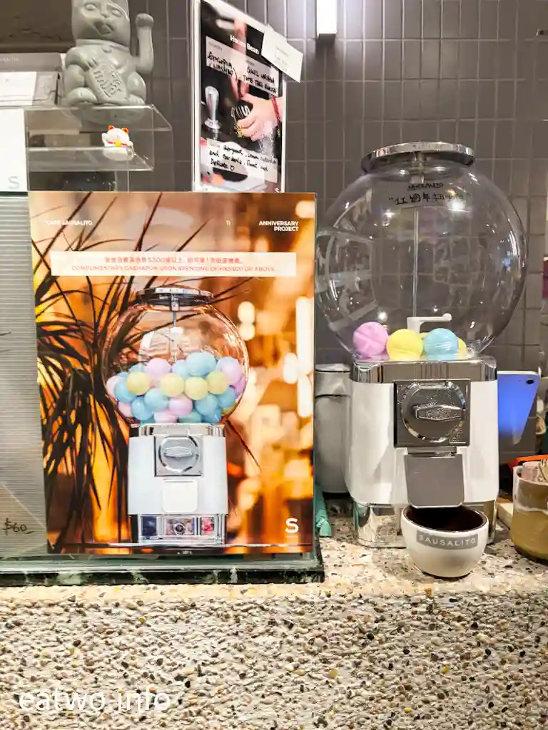 呢間咖啡店目前已經開業11年,來自80後年輕人,2025年11月剛好有限定週年優惠,只要食滿$300,就有一個代幣附送,可以憑代幣玩一次扭蛋。Cashier旁邊有部可愛扭蛋機,每隻蛋入面有一張紙,是次E.A.Two就扭出一包該店自行出產嘅掛耳咖啡包。不過,細心發現其實有機會所有蛋都係掛耳咖啡包,因為牆上面無咩其他選擇,感覺呢個只係一個非常有儀式感嘅推廣方法。換言之,滿$300就會送出一包價值$20嘅掛耳咖啡包。
