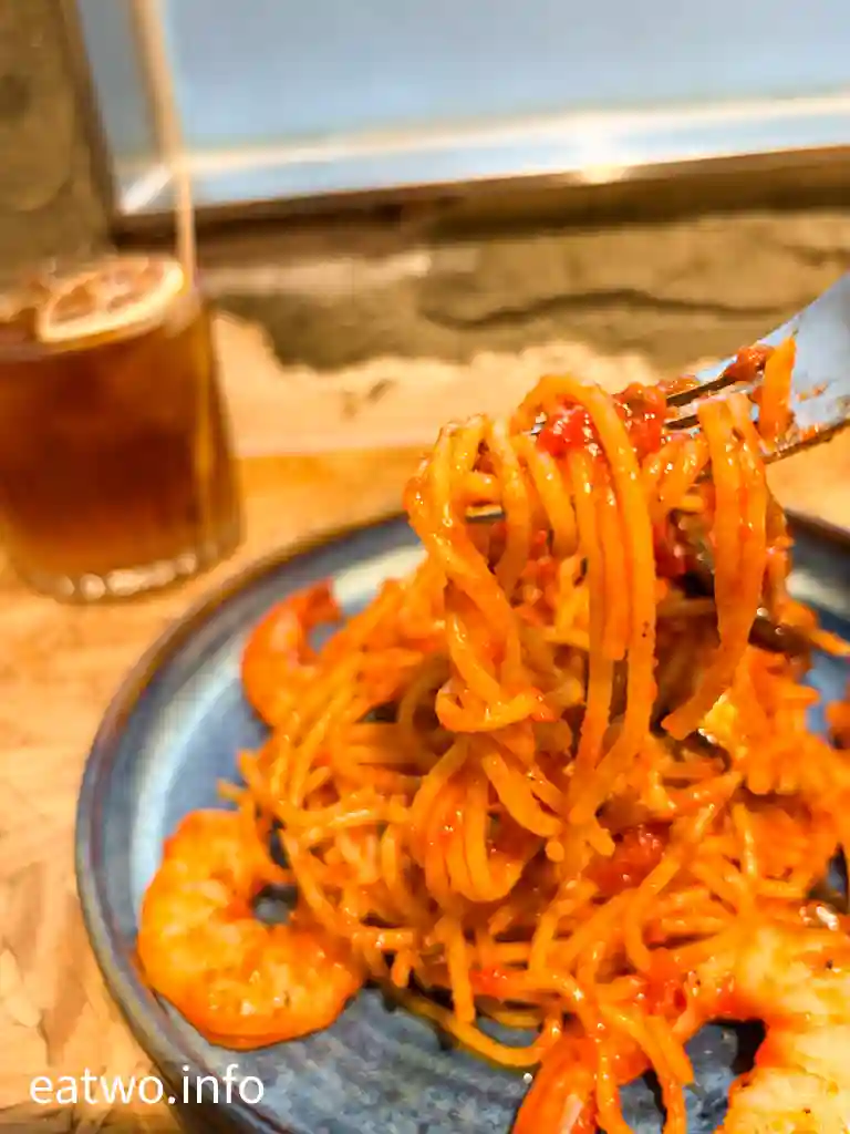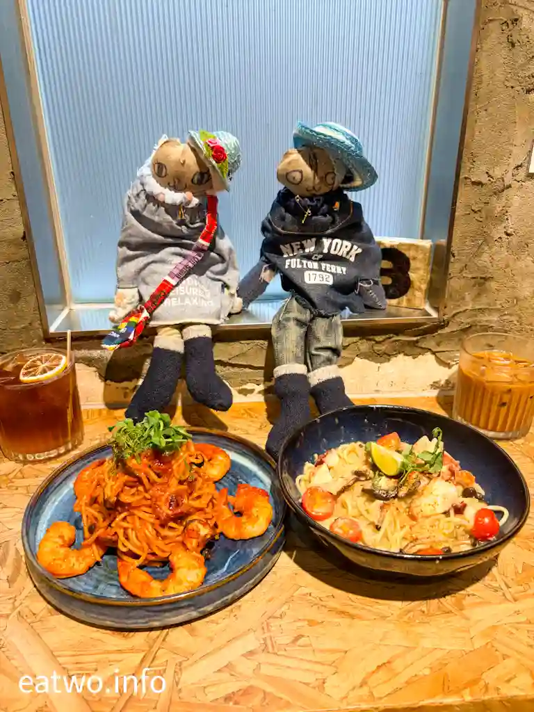 望落幾特別嘅有由bagel製作嘅芝士牛肉麵包圈$86、牛油果煙三文魚忌廉芝士麵包圈$89,而自家製Tiramisu或是日蛋糕就賣$60。難得係咖啡店都有主食可以選擇,今次就揀咗秘製蕃茄醬炸蝦意粉$112、慢煮八爪魚蒜香緹魚意粉$138。意粉份量唔算多,只係擺盤擺得幾靚幾有心思。慢煮八爪魚蒜香緹魚意粉不過不失,意粉爽滑彈牙,醬汁濃稠而不膩。而秘製蕃茄醬炸蝦意粉就更驚喜,雖然大蝦係雪藏蝦,但係靚嘅雪藏蝦,而意粉同樣爽滑彈牙,蕃茄醬汁酸甜中帶有微微辣味,似蕃茄加車厘茄,除咗蕃茄蓉,亦有洋蔥,入口甚至有少少類似黑椒嘅調味料。