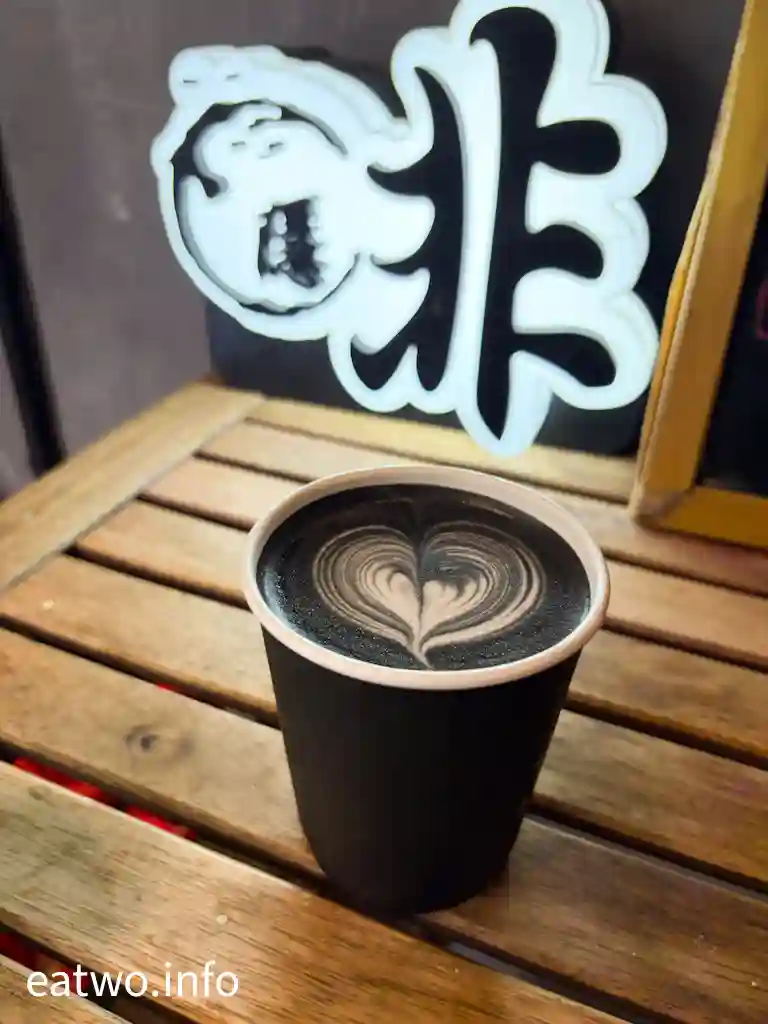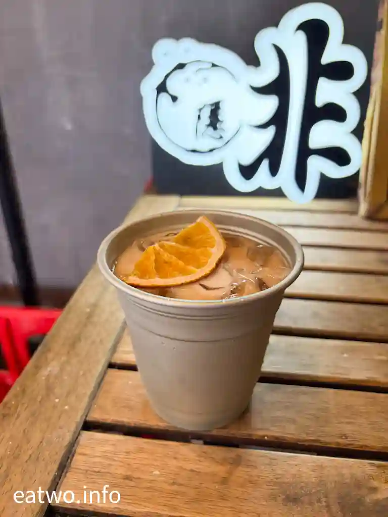 除咗有典型黑白咖啡,亦有特調咖啡同茶。最特別嘅係特調黑咖啡$48、暗黑系牛奶咖啡$45、鮮橙朱古力牛奶咖啡$48、青瓜鮮奶咖啡$45、有汽檸檬咖啡$45,今次就挑選一杯暗黑系Latte、鮮橙Mocha。呢杯Latte被染成黑色,熱飲有靚靚拉花,原來所謂暗黑就係食品級竹炭,而Mocha就加入香橙片。