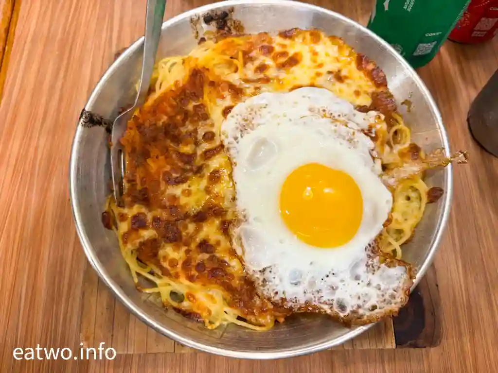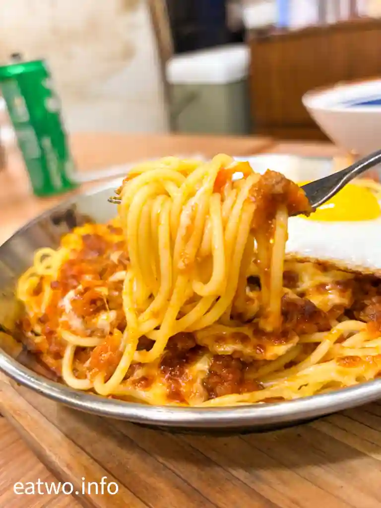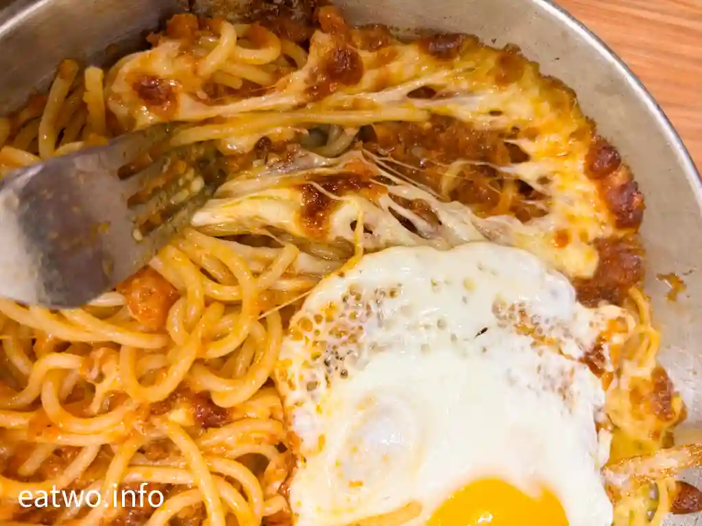 好多菜式都同芝士有關,有部份就似乎比較少人選擇,索性試埋芝士焗肉醬意粉加煎蛋$58,可以配飯或意粉。簡單嚟講,就好似焗肉醬意粉,只不過上面加頂帽,即係煎蛋,而且係好港式同有燶邊嘅煎蛋。芝士同肉醬意粉混合,芝士微融,同撈麵一樣並非好膩嘅感覺。
