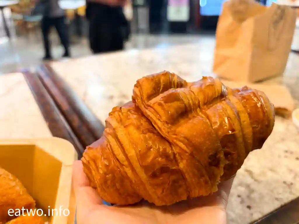 平常香港地菠蘿油只係烘熱菠蘿包入面放上一片厚厚鮮牛油,麵包將牛油慢慢溶化,冷熱交融。而呢款菠蘿油入面就唔係普通牛油,而係一款混合咖啡嘅牛油,所以入口時唔單止有牛油口感,同時有咖啡味,味道獨特而唔會太搶。就算只係普通牛角包,都唔係省油的燈,牛角包既酥脆,入面係鬆軟而可以絲絲拉開。E.A.Two之後發現,好似重有款蛋撻咖啡,有興趣不妨嚐鮮吓。