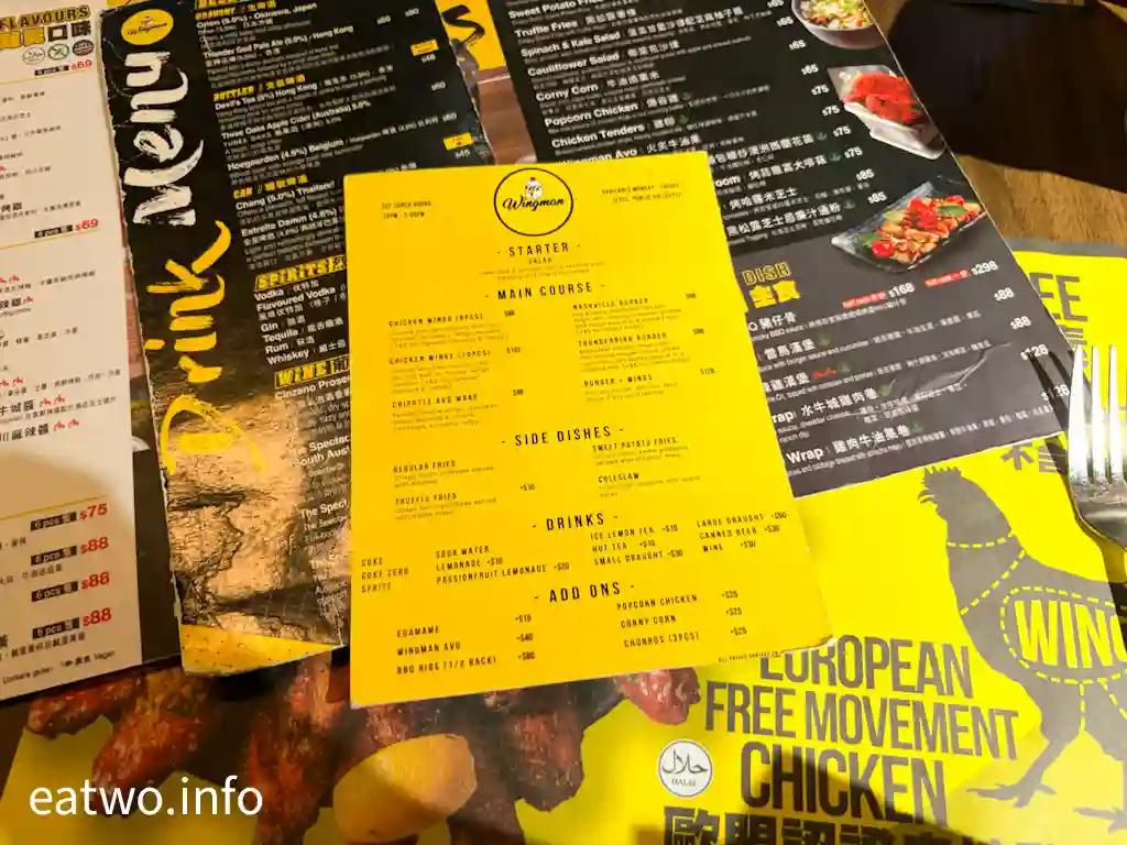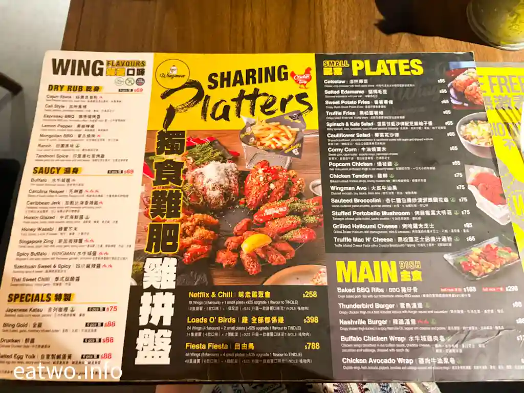 E.A.Two今次就無選擇任食吃到飽嘅雞翼放題,中午時段選擇咗只限平日嘅套餐,人均最平只係$88/8隻、$103/10隻,最貴嘅漢堡餐都係$128。不過,餐牌設計加上燈光,真係幾難睇,就算識英文,都覺得好複雜難睇,啲字又細隻,下次記得睇定餐牌先去,或者帶個放大鏡去睇。而今次選擇嘅係8隻雞翼餐$88,重有混亂嘅地方係選擇唔同指定口味嘅雞翼。不過,該店嘅餐牌設計有啲混亂,要睇點配搭嘅時候都幾難搞,一份套餐可以揀兩款雞翼口味,而分別係需要喺兩個column入面各揀一款,或者加$5要特別口味。