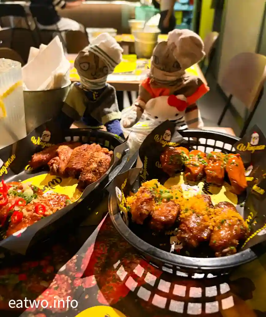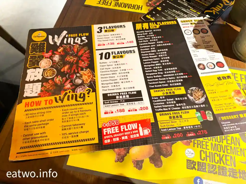 雞翼放題限時90分鐘,有3款口味嘅放題同10款口味嘅放題,同時分平日同週末假期嘅價錢,3款口味只係$138至$148,而10款口味就需要$188至$208,加$150可以任飲烈酒、啤酒、紅白酒,可以同時用啤酒配雞翼。而雞翼本身有超過20款口味,都係選用無激素走地雞,飼養時無使用抗生素。店內雞翼口味包含有金雞、水牛城醬、紐奧良香粉、加州風情、死神醬、加勒比海香辣雞、醉雞、咖啡燒烤醬、中式海鮮醬、蜂蜜芥末、黑椒檸檬、蒙古燒烤、田園風味、自家製鹹蛋黃、新加坡辣蟹、自家水牛城醬、四川甜辣醬、印度唐杜里烤雞、泰式甜酸醬。