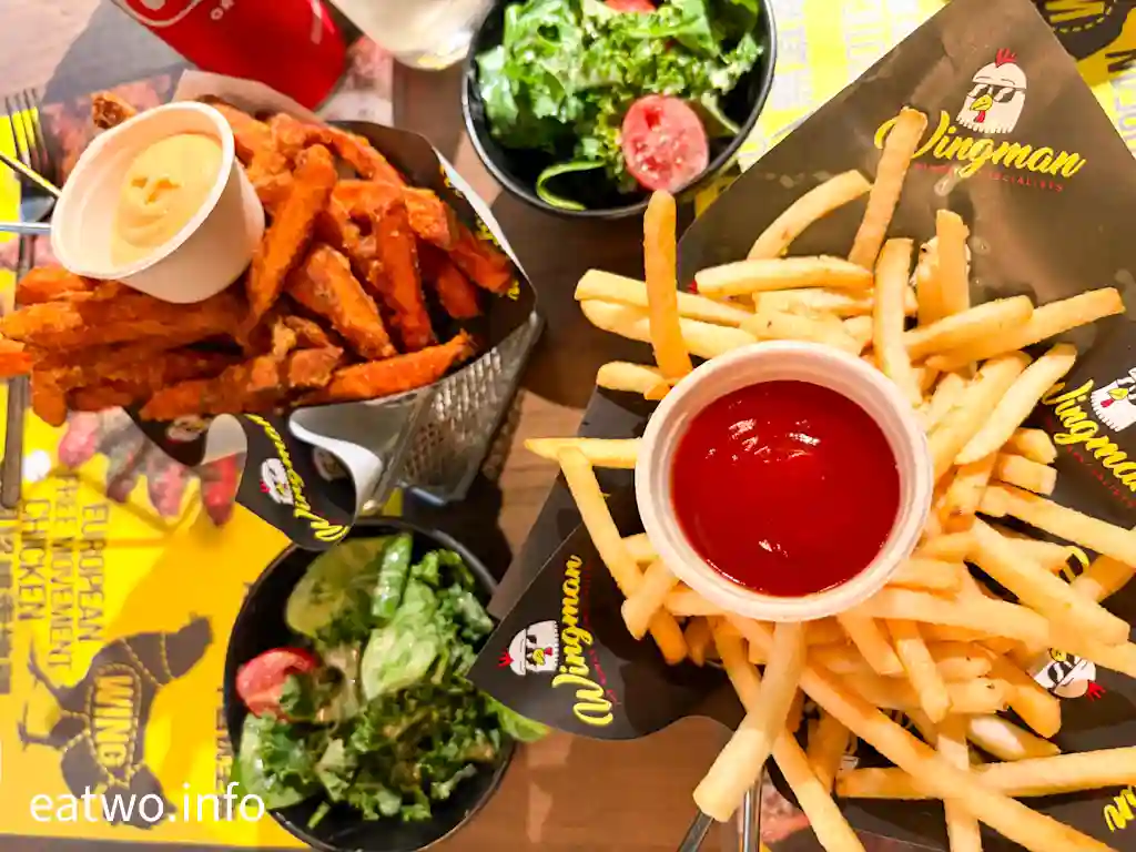 除咗可以點雞翼放題,亦可以加點小食同飲品放題,人均需要$260至$278。小食有薯條、椰菜花沙律、涼拌椰菜、鹽焗毛豆、黑松露芝士忌廉汁通粉,飲品就有汽水同指定啤酒、檸檬茶。此外,甚至可以加蘸醬,加$10至$25就可以再加蘸醬任蘸雞翼。同朋友聚會時,有可能會遇上堅持素食嘅人,而店內都有素食可以選擇,所以都係歡迎素食人士,包括純素雞翼$88/6隻、素爆谷雞$68/6隻、素雞漢堡$98,重有款西班牙油炸鬼嘅甜點。