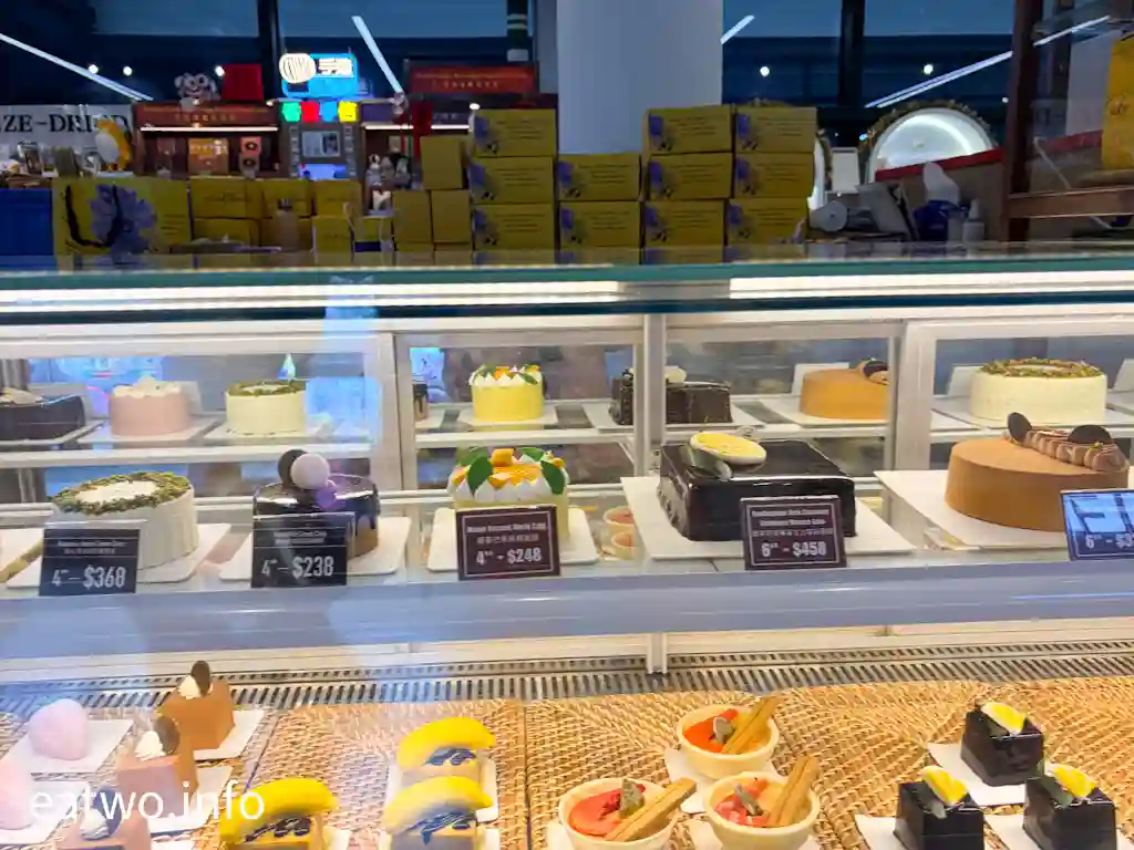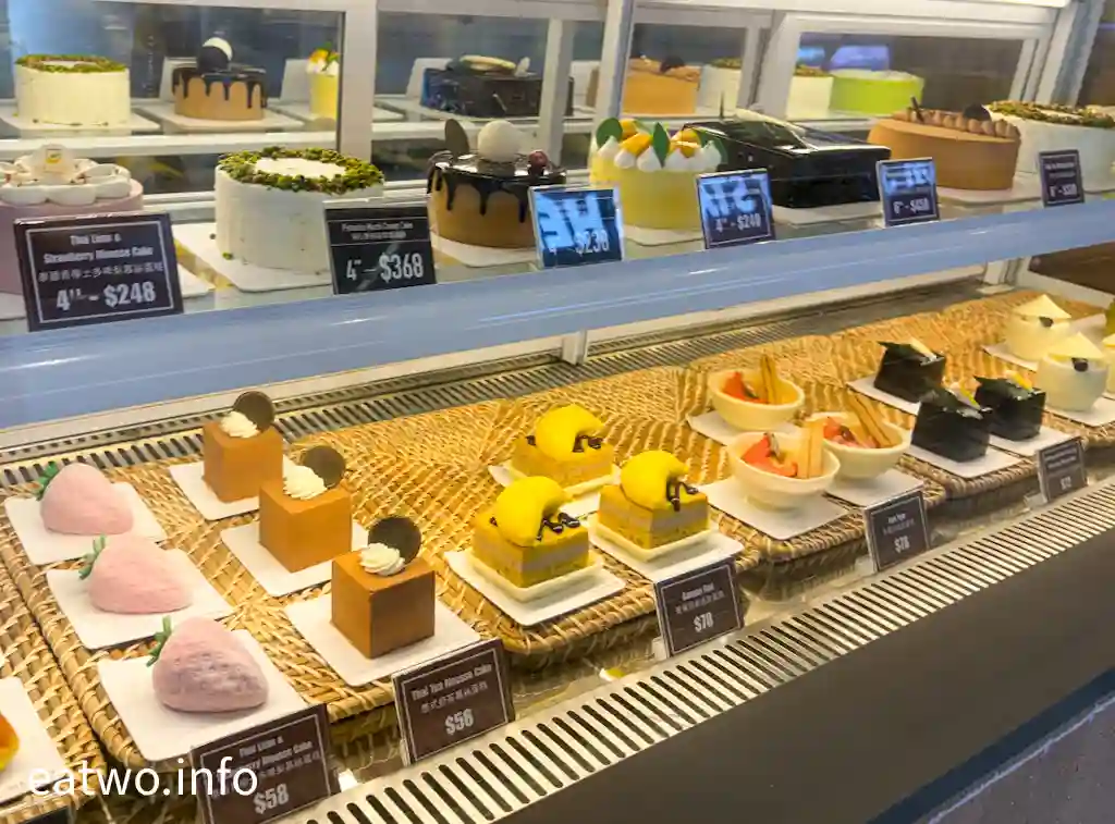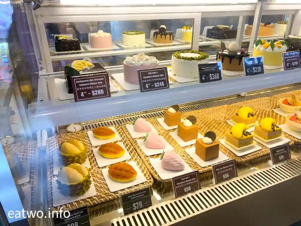 主要係慕絲麻糬蛋糕,有榴槤味、芒果味、泰式青檸士多啤梨味、泰式奶茶味、香蕉煎餅味、冬蔭功味、椰青味、香茅青柑檸黑朱古力味,價格係$58至$78。每件都係精緻型蛋糕,都有成個好似平時生日蛋糕咁嘅size,大小係4吋起,適合唔想食好大個蛋糕嘅人,最平係$248,最貴就要$688。原個蛋糕口味有香茅青柑檸味、青檸士多啤梨味、開心果味、椰香芒果味、美祿味、泰式奶茶味、抺茶味。