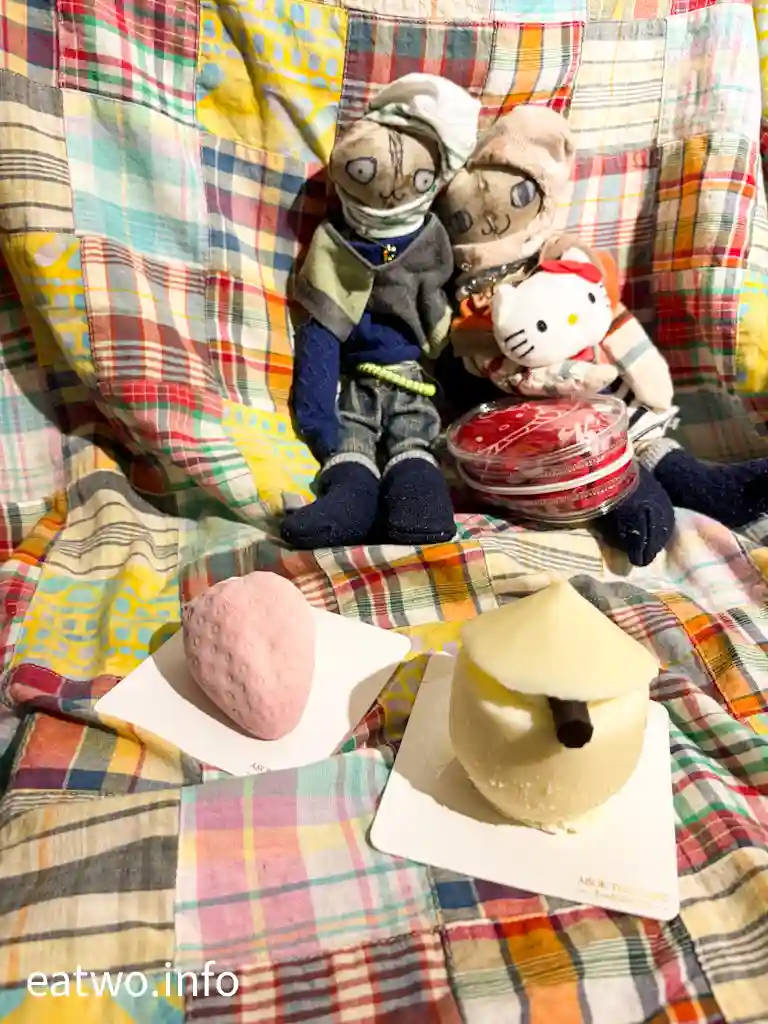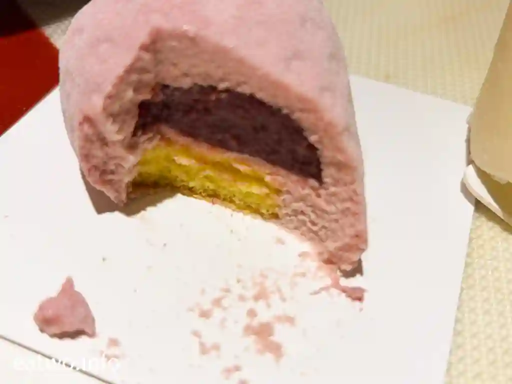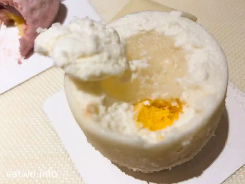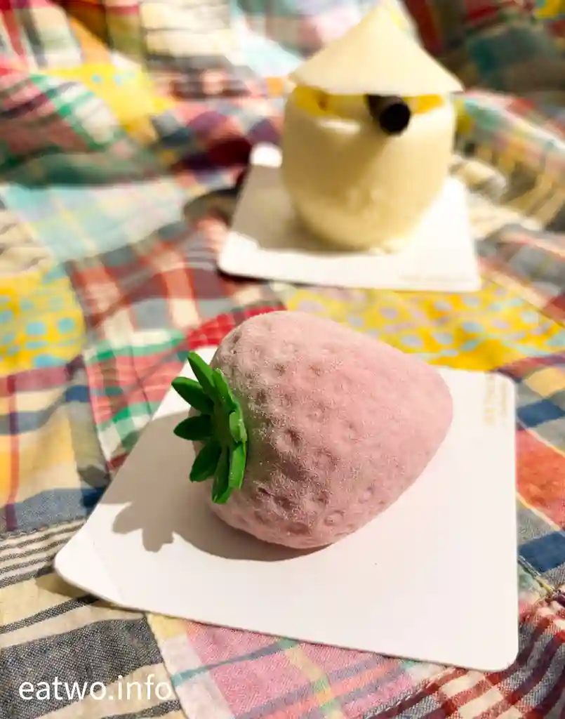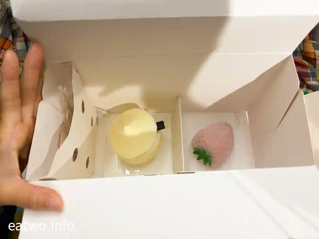 椰青味就係一個模仿椰青嘅蛋糕仔,可以開蓋,不過大部份都係白朱古力,亦有扮成飲管嘅黑朱古力,入面就係慕絲蛋糕同少量海綿蛋糕,中間就有少少椰青味,但椰青味太少,基本上唔係好食得出。而士多啤梨造型就比較少白朱古力成份,大部份都係慕絲蛋糕,質感係比較柔軟,而入面內餡就有少少海綿蛋糕,中間就有士多啤梨味,青檸味就無乜,不過食落就似果jam味。